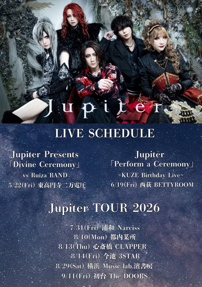 Jupiter TOUR 2026 SCHEDULE 2026/07/31(金) 00:00 - 2026/09/12(土) 23:59 Jupiter TOUR 20267/31(Fri)浦和 Narciss8/10(Mon)都内某所8/13(Thu)心斎橋 CLAPPER8/14(Fri)今池 3STAR8/29(Sat)横浜 Music Lab.濱書房9/11(Fri)初台 The DOORS ※詳細は近日発表 URLをコピーする 報告する